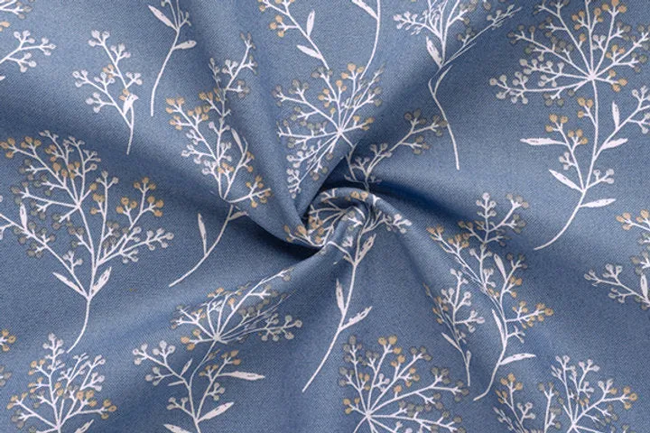 La tela presentada tiene un fondo en un tono azul pastel o azul claro, que puede ser la representación del «azul pastel» mencionado en la descripción. Sobre este fondo, hay un diseño de ramas y hojas en un color blanco o crema muy claro. Además, hay toques de un color dorado o ámbar en algunas de las hojas y flores, lo que añade un acento de color y un toque sofisticado al diseño general.