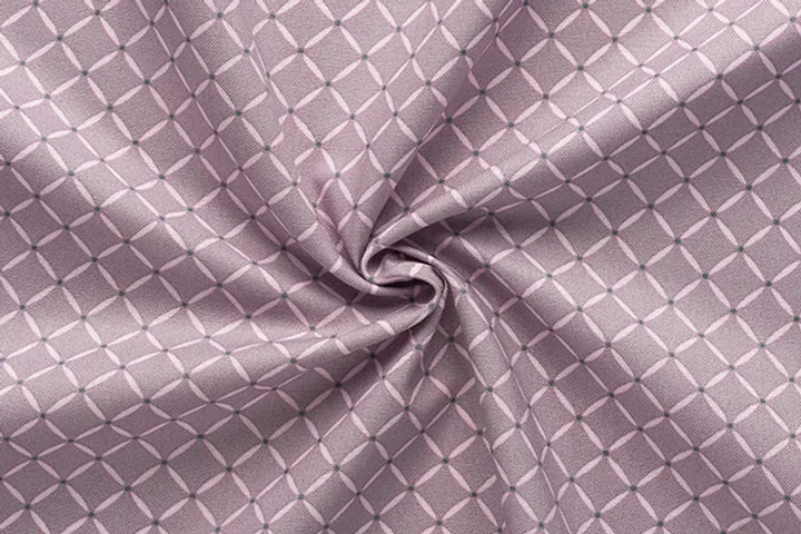 Este tejido muestra un diseño geométrico similar al de las otras telas, pero en esta ocasión, se presenta en tonos de rosa o malva pálido, con líneas diagonales formando una retícula y puntos blancos en las intersecciones. La paleta de colores es suave y da una sensación de calidez y sofisticación.