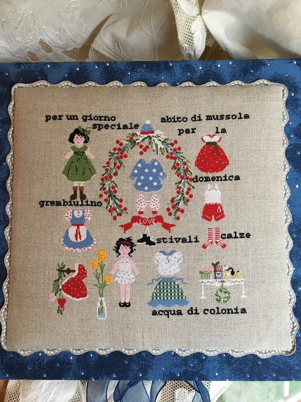 «Agua de colonia» es un esquema de punto de cruz contado en color que representa muñecas y vestidos.