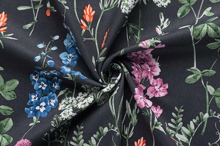 La tela presentada en la imagen tiene un fondo oscuro, que podría ser el «antracita expresivo» mencionado en la descripción. Está adornada con un estampado floral diverso y colorido, incluyendo flores en tonos de azul, rosa, blanco y naranja. Las flores y hojas tienen una representación detallada, lo que añade un toque de elegancia y sofisticación al diseño.