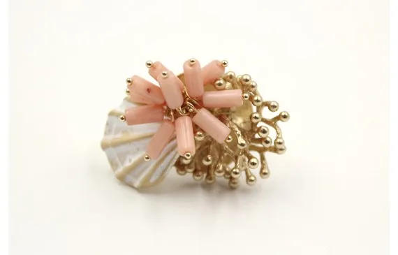 Anillo regulable de latón con cilindros de coral rosa, concha esmaltada y flor coral de latón Pago Seguro