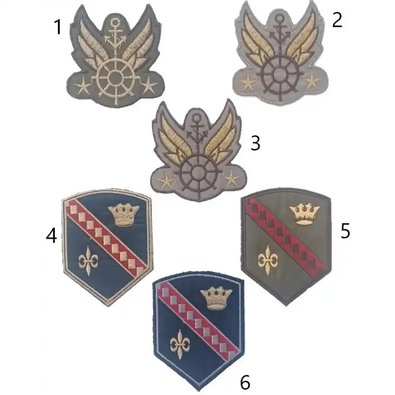 Los apliques bordados termoadhesivos de insignias navales E56 ofrecen una representación detallada y simbólica del mundo marítimo y militar. Cada modelo presenta un diseño meticulosamente bordado con hilos de calidad, replicando con fidelidad elementos icónicos como anclas, ruedas de timón y alas (Modelos 1, 2, 3), o escudos heráldicos con coronas y flores de lis (Modelos 4, 5, 6). El bordado de alta calidad asegura la durabilidad del diseño y una textura visual auténtica, aportando un gran realismo a cada parche. Su naturaleza termoadhesiva permite una aplicación rápida y sencilla con una plancha doméstica, lo que los hace accesibles para la personalización sin necesidad de coser, aunque para una fijación permanente y resistente a lavados frecuentes, se recomienda un cosido adicional. Estos apliques son ideales para personalizar uniformes (no oficiales), chaquetas, gorras, mochilas, maletas, estuches y cualquier otro artículo textil, añadiendo un toque distintivo y un homenaje a la navegación y las fuerzas navales.