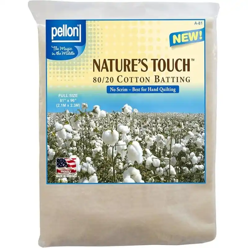 Guata 100% algodón, ligera y flexible, ideal para quilting y patchwork. Medida 2,30 x 2,75 m, grosor 2 mm y encogimiento controlado del 3–5%.
