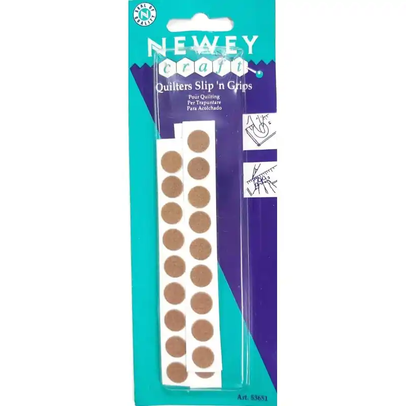 Los Newey Quilters Slip ‘n Grips son una herramienta esencial para cualquier aficionado o profesional del patchwork y el quilting. Estos pequeños círculos adhesivos, con una superficie texturizada similar a la lija fina de color marrón claro, se aplican fácilmente en la parte posterior de tus reglas, escuadras y plantillas. Su función principal es evitar el deslizamiento de estas herramientas sobre el tejido mientras realizas cortes con cúter rotatorio o marcas patrones, garantizando así una mayor precisión y seguridad en cada proyecto. El blíster, con su distintivo empaque azul y verde como se muestra en la imagen, contiene múltiples círculos listos para usar, asegurando que tus herramientas de medición permanezcan exactamente donde las necesitas.