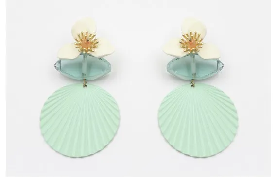 Artesanal Pendientes perno flor esmaltada blanca, ovalo de vidrio africano verde con colgante disco ondulado esmaltado turquesa. Largo 6cm.