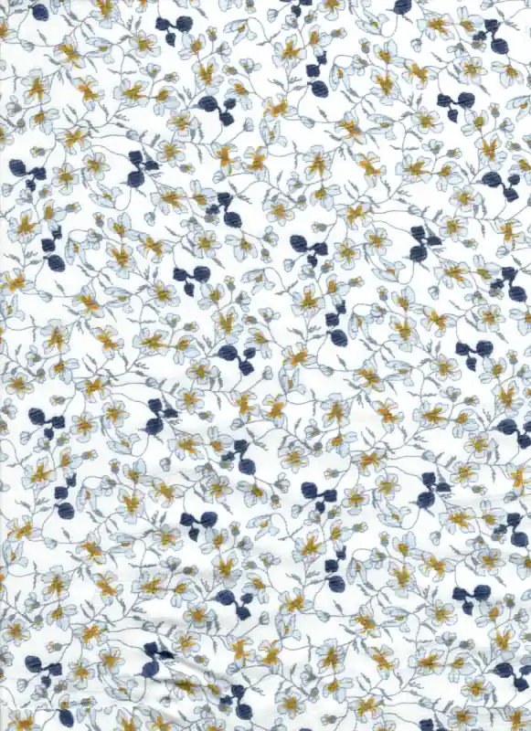 Viscosa de fondo blanco con estampado de flores en tonos azules y ocre