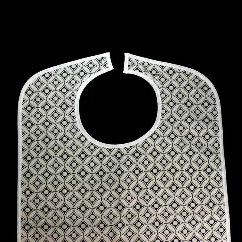 Práctico y elegante babero para adultos con estampado geométrico, ideal para proteger la ropa durante las comidas sin renunciar al estilo. Fabricado con materiales resistentes, ligeros y fáciles de limpiar, este babero ofrece una excelente cobertura y comodidad, adaptándose perfectamente al contorno del cuello gracias a su cierre con corchetes ajustables.