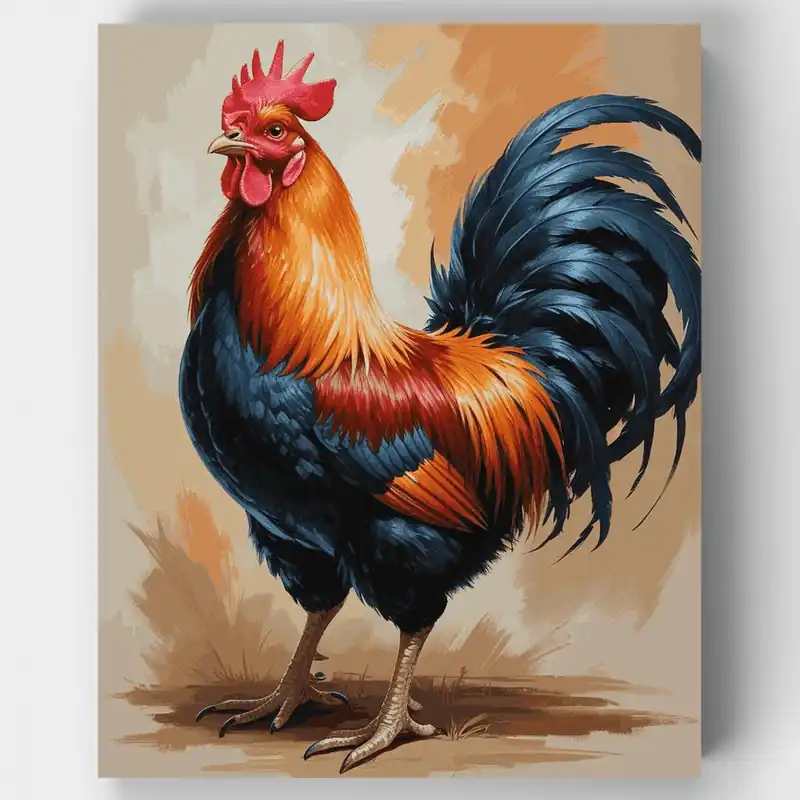 Bring vibrant farmyard elegance to life with this stunning paint by numbers kit featuring a magnificent rooster. This beautifully detailed design showcases a proud rooster adorned with brilliant orange and fiery red plumage contrasted against striking blue-black feathers and a dramatic flowing tail. The warm, artistic background complements the rooster’s regal stance, creating a captivating piece that celebrates the beauty of rural wildlife. Perfect for both beginners and experienced painters, this kit includes everything you need to create a gallery-worthy masterpiece that captures the spirit and personality of this iconic barnyard bird.Who Will Love It?This rooster paint by numbers kit is ideal for animal lovers, farm enthusiasts, and anyone who appreciates bold, colorful artwork. Whether you’re a beginner looking for a rewarding creative project or searching for a unique gift for someone who loves wildlife and rustic charm, this kit delivers hours of relaxing, meditative painting enjoyment. The detailed design offers enough complexity to keep experienced painters engaged while remaining accessible to newcomers. Add a touch of country elegance to your home decor or gift this stunning rooster portrait to someone special today.