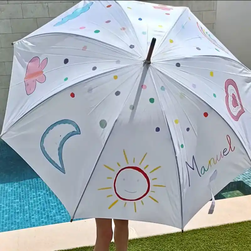 Paraguas de 8 paneles confeccionado en poliéster. De 105cm de diámetro, con apertura manual, varillas metálicas en color negro y cierre de velcro. Palo y mango fabricados en suave madera de color natural, con tela de color blanco.
