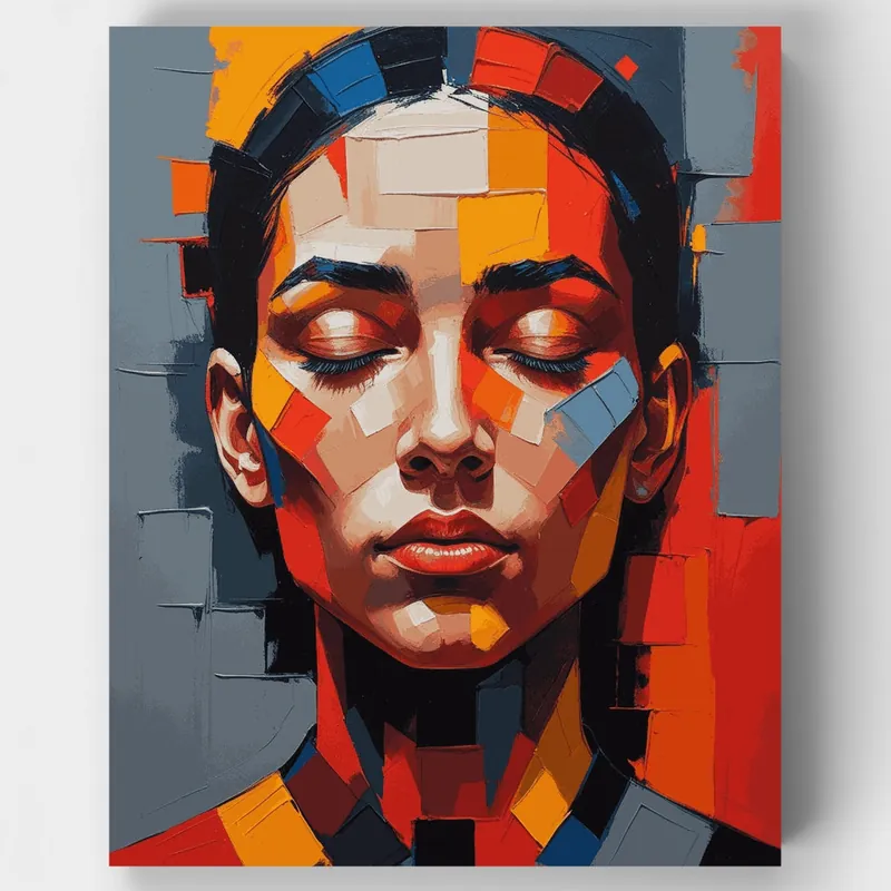 Sumérgete en el mundo del arte moderno con este impresionante \\\\»kit de pintar por números\\\\» que presenta un retrato de inspiración cubista. La obra muestra una composición impactante con formas geométricas en vibrantes tonos naranjas, rojos, azules y neutros, creando un retrato contemporáneo con ojos cerrados y rasgos audaces. Cada sección cuidadosamente numerada te guía para recrear esta expresiva pieza que combina elementos abstractos con arte figurativo.¿A quién le encantará?Este kit es perfecto para entusiastas del arte que aprecian estilos artísticos modernos, principiantes que desean explorar el cubismo, y cualquier persona buscando una experiencia creativa meditativa pero gratificante. La audaz paleta de colores y el diseño geométrico lo convierten en una excelente opción para quienes desean añadir una pieza de arte contemporáneo a su hogar. ¡Comienza tu viaje artístico hoy y transforma tu espacio con este cautivador retrato!