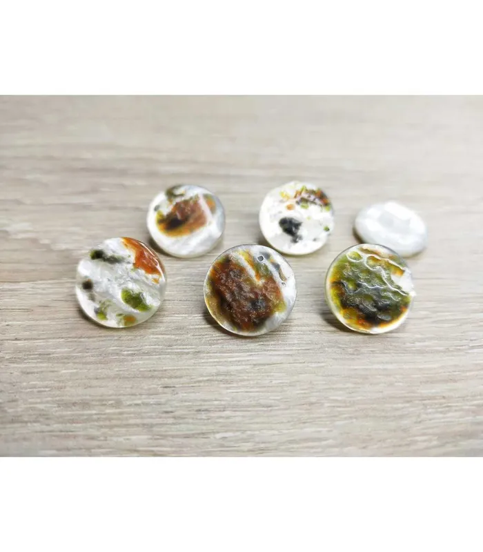 Botón de resina en color blanco con pintas de colores. Ningún botón es exacto a otro.