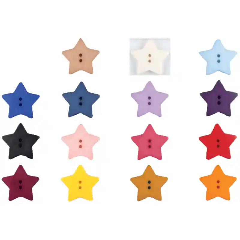 Botón Dill en forma de estrella, fabricado en plástico de alta calidad, ideal para confección infantil, manualidades y decoración. Disponible en dos tamaños (1,5 cm y 2,8 cm) y una extensa gama de 14 colores vibrantes que incluyen tonos neutros y llamativos para combinar con cualquier proyecto.