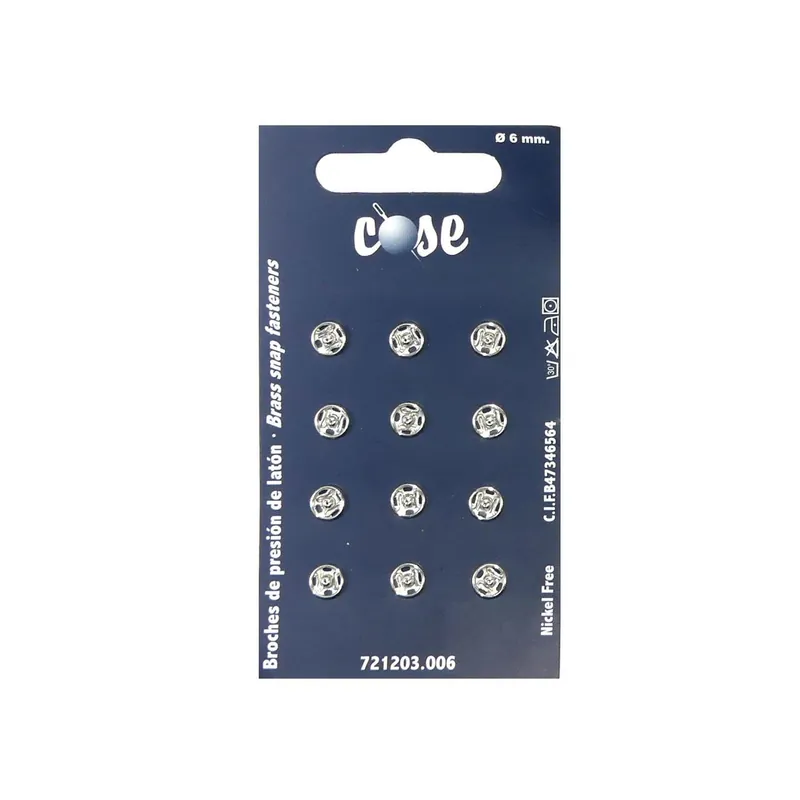 Clásicos broches de presión para coser en colores metalizados. Muy resistentes y fáciles de colocar, aguantando perfectamente cualquier tratamiento de la prenda.