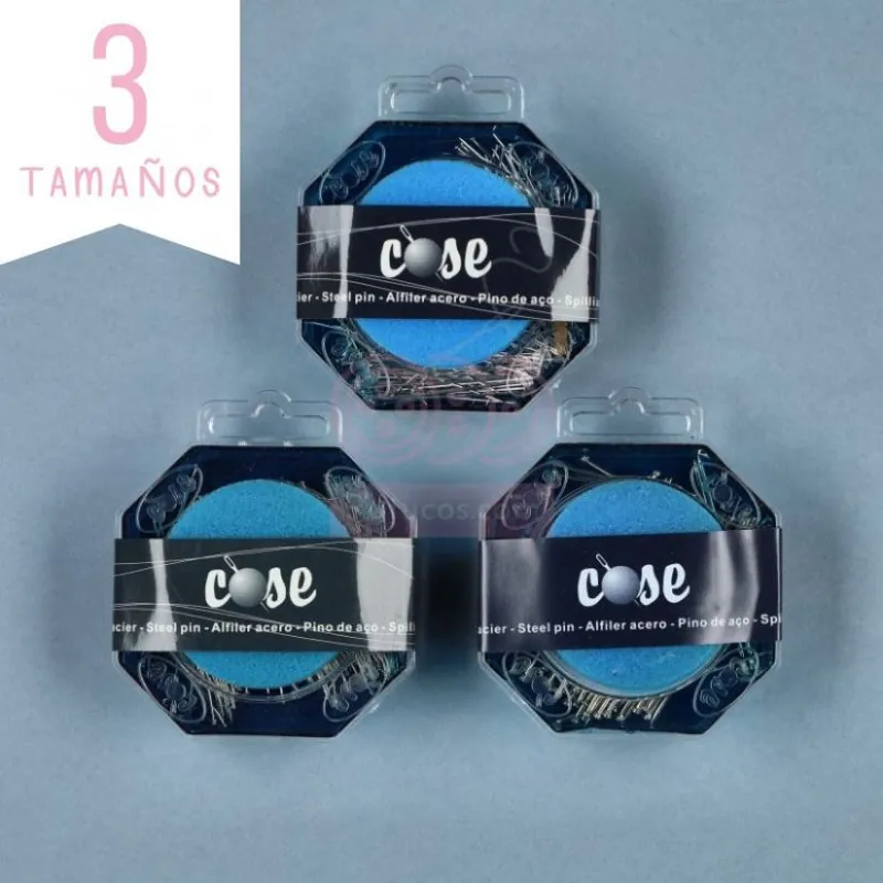 Caja de alfileres de acero, disponibles en tres medidas de largo y de diámetro.