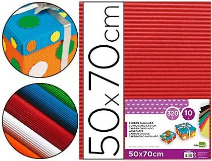 Cartón ondulado de 320 g/m². Gran resistencia y colores intensos. Presentación en bolsa de celofán. Medidas de la hoja: 50 x 70 cm.