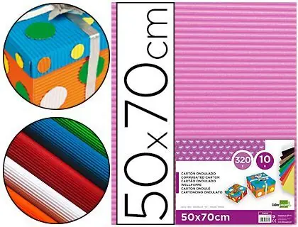 Cartón ondulado de 320 g/m². Gran resistencia y colores intensos. Presentación en bolsa de celofán. Medidas de la hoja: 50 x 70 cm.