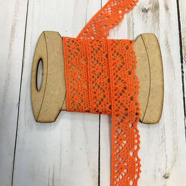 Es una cinta para mercería de color naranja rematada de forma muy original. Está fabricada en algodón 100% y mide 2cm de ancho.