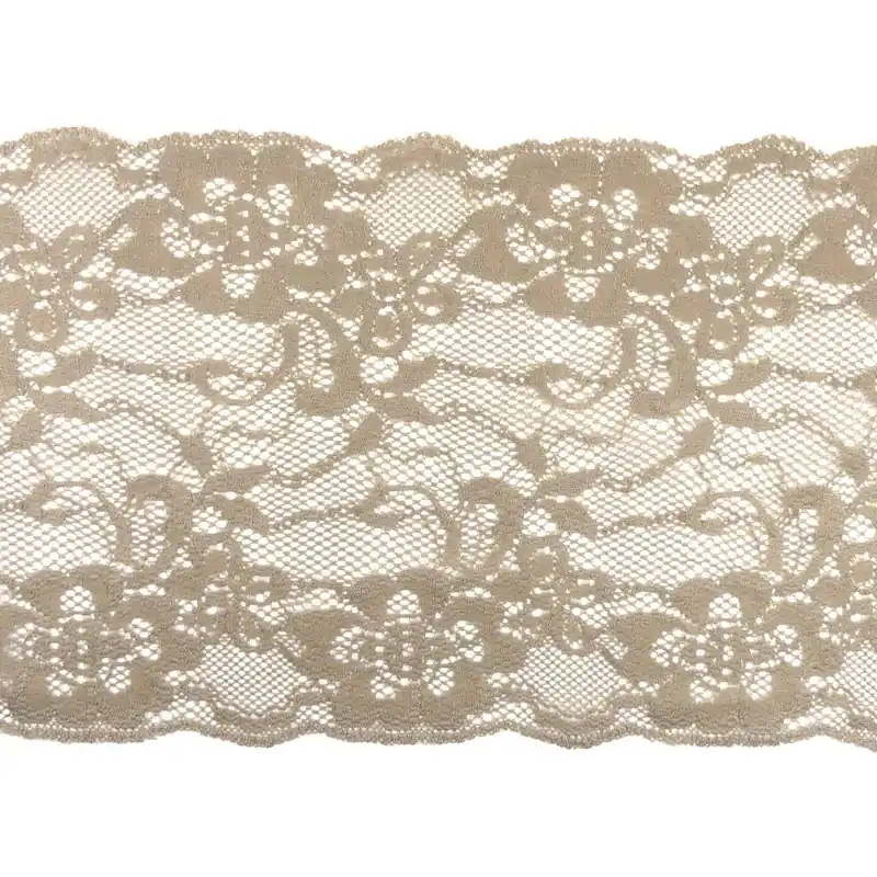 Entredós de nylón elástico, con una elasticidad media del 190%. De 14cm de ancho y muy suave al tacto. Puede lavarse sin problemas hasta los 40º, admite plancha y se recomienda no introducir en secadora.