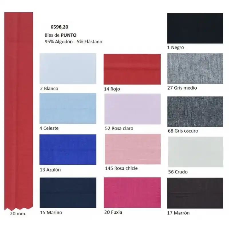 Descripción: La cinta bies de punto, con un ancho de 20 mm, está diseñada para proporcionar un acabado impecable y flexible a tus creaciones. Su tejido de punto, con un alto porcentaje de algodón, garantiza una sensación agradable al tacto, mientras que el elastano incorporado asegura que la cinta se adapte y recupere su forma, evitando deformaciones. Es especialmente adecuada para rematar bordes curvos o para añadir un toque elástico a escotes, sisas y puños en proyectos de confección. La variedad cromática permite una integración perfecta con cualquier diseño, desde prendas de vestir hasta accesorios de patchwork y manualidades.