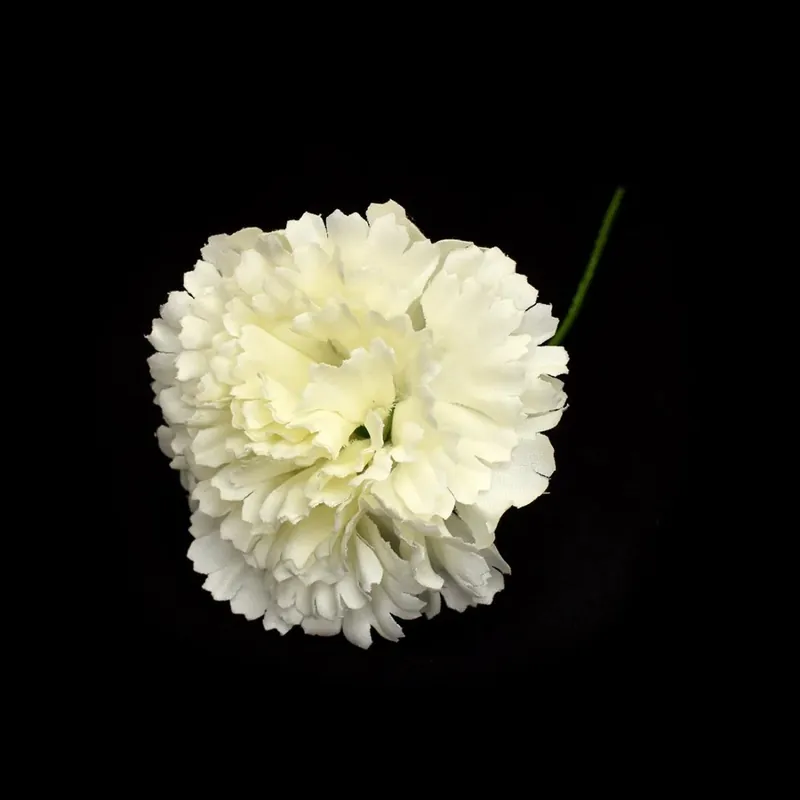 Clavel artificial en color blanco, fabricado en tejido textil de alta calidad con un acabado muy realista y elegante. La flor mide aproximadamente 9 cm de diámetro y cuenta con un tallo de alambre forrado en verde de 13 cm de largo, totalmente flexible para facilitar su colocación en arreglos florales o estructuras decorativas. Su diseño detallado y volumen generoso imitan fielmente la forma y textura del clavel natural, convirtiéndolo en una opción perfecta para decorar sin preocuparte por el mantenimiento.
