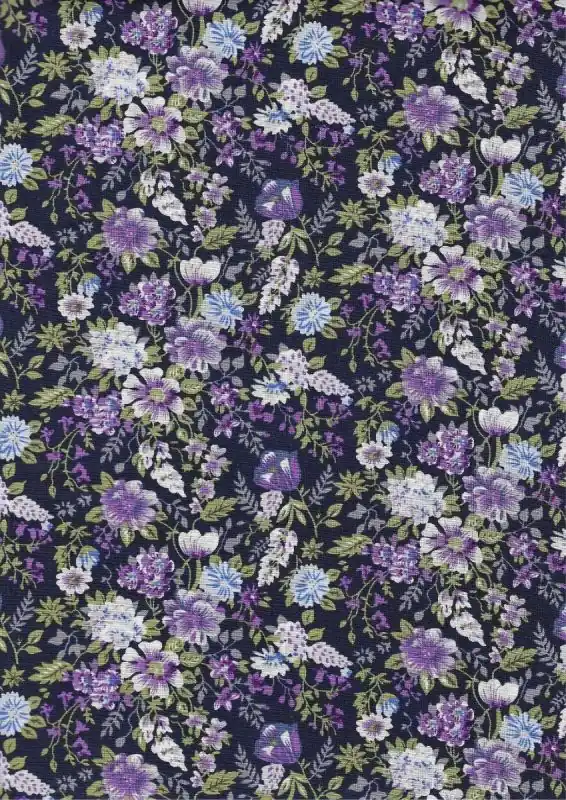 Algodón de fondo azul noche con estampado en tonos lilas y morados