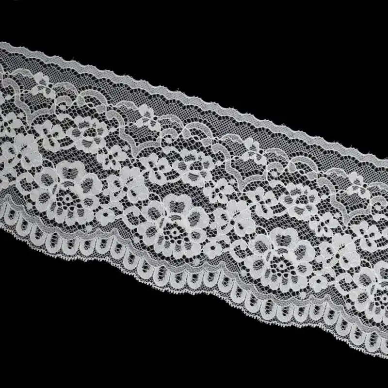 Puntilla de nylon disponible en color blanco y color negro. Con esta puntilla podrás rematar todo tipo de prendas o accesorios. Ideal para coser en vestidos, faldas, camisas… Tiene un diseño muy elegante y sofisticado. Mide 11cm de ancho total. Su acabado es de gran calidad. Precio por metro.