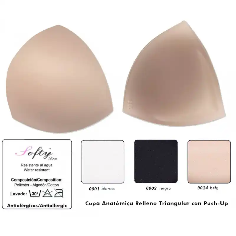 Estas copas triangulares con relleno son ideales para realzar el busto en bikinis y sujetadores. Fabricadas con una mezcla de poliéster y algodón, ofrecen comodidad y resistencia, incluso en contacto con el agua. El diseño incluye un efecto push-up para mejorar la forma y el volumen del pecho. Además, son antialérgicas, lo que las hace adecuadas para pieles sensibles.