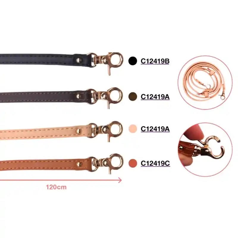 Correa de cuero vegano de 120 cm, disponible en negro, beige, marrón y cámel. Ideal para bolsos artesanales o de confección propia. Flexible, resistente y de acabado elegante. Ideal para tus proyectos de costura más creativos.