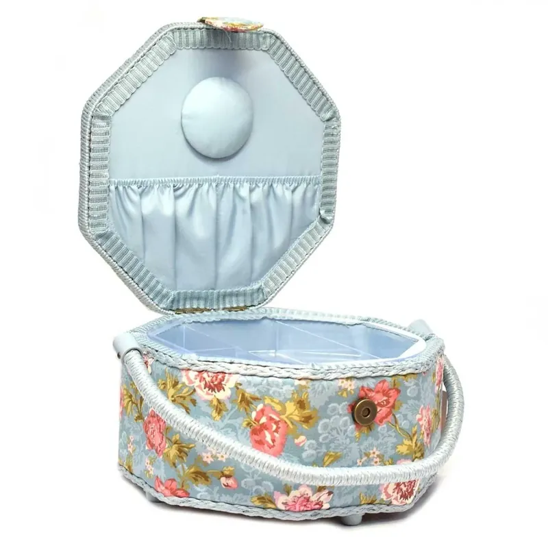 Costurero octogonal forrado de tela en color turquesa con estampado de flores, ideal para quienes buscan una solución práctica y decorativa para organizar sus utensilios de costura.