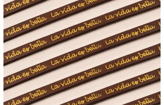 Cuero 10mm Marrón grabado «La vida es bella» para hacer pulseras y collares. Descubre nuestros lazos, hilos y Cuero y piel , así como de otros materiales con distintos acabados, grosores y colores para crear gran variedad de piezas de diseño y bisutería.