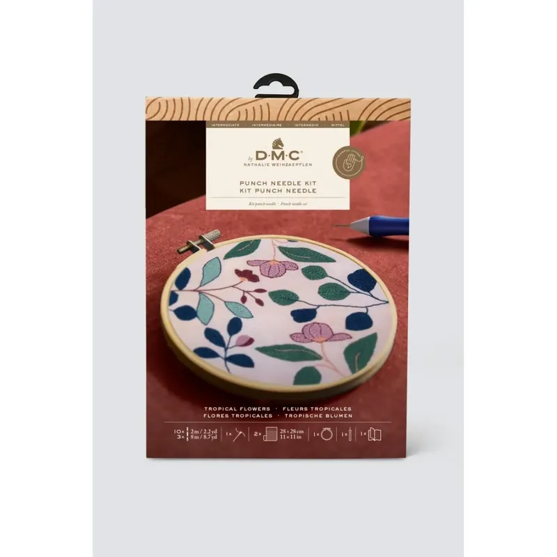 Una moderna composición de flores y hojas, este kit de punch needle ha sido diseñado por Nathalie Weinzaepflen, cuyos diseños se inspiran en viajes y fondos marinos. Este kit se completa con una aguja punch needle fina que necesitarás para trabajar con hilos finos. La tela base está preimpresa con el diseño para que puedas dentrarte en el proceso de bordado directamente. La Colección Diseñadoras de kits de bordado muestra el trabajo de talentosas diseñadoras de todo el mundo. Esta variada gama celebra estilos clásicos y contemporáneos. Puedes elegir entre una selección de técnicas de bordado populares en varios niveles, incluyendo bordado, punto de cruz, tapicería y punch needle. EL KIT INCLUYE: 10 x Mouliné Spécial® madejas 2m – 100% algodón 3 x Mouliné Spécial® madejas 8m – 100% algodón 1 x tela impresa 28 x 28 cm – 100% algodón 1 x tela 28 x 28 cm – 100% algodón 1 x aguja punch needle 1 x hoop 18.5 cm 1 x aguja 1 x explicaciones EN / FR / SP / DE / IT / PT / NL / JA. Medidas: 17.8 x 17.2 cm.