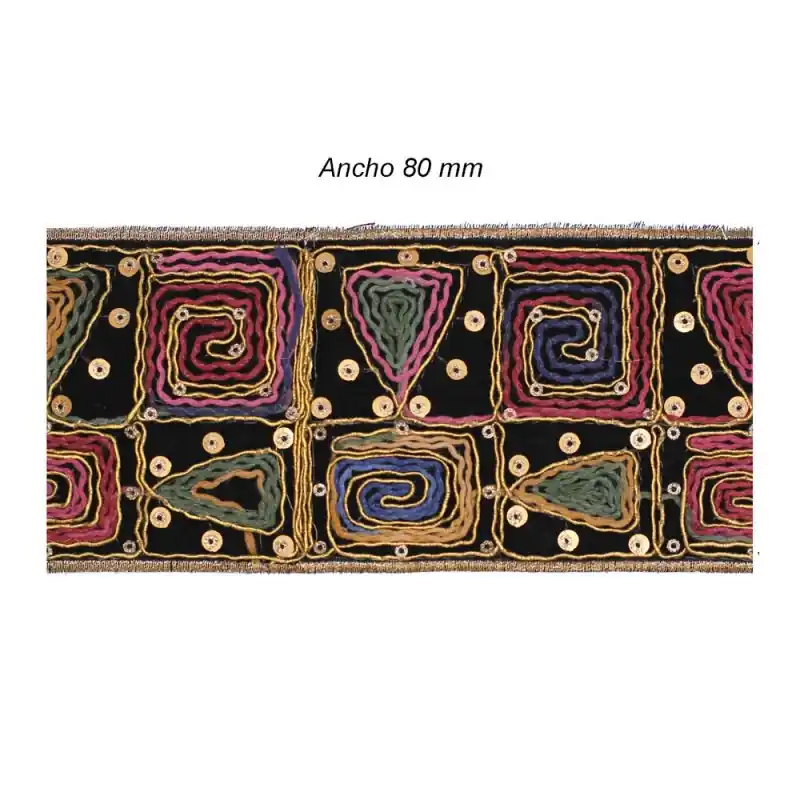 Galon bordado multicolor con hilo metalizado y lentejuelas sobre terciopelo negro. Ancho 80mm. (Metros)