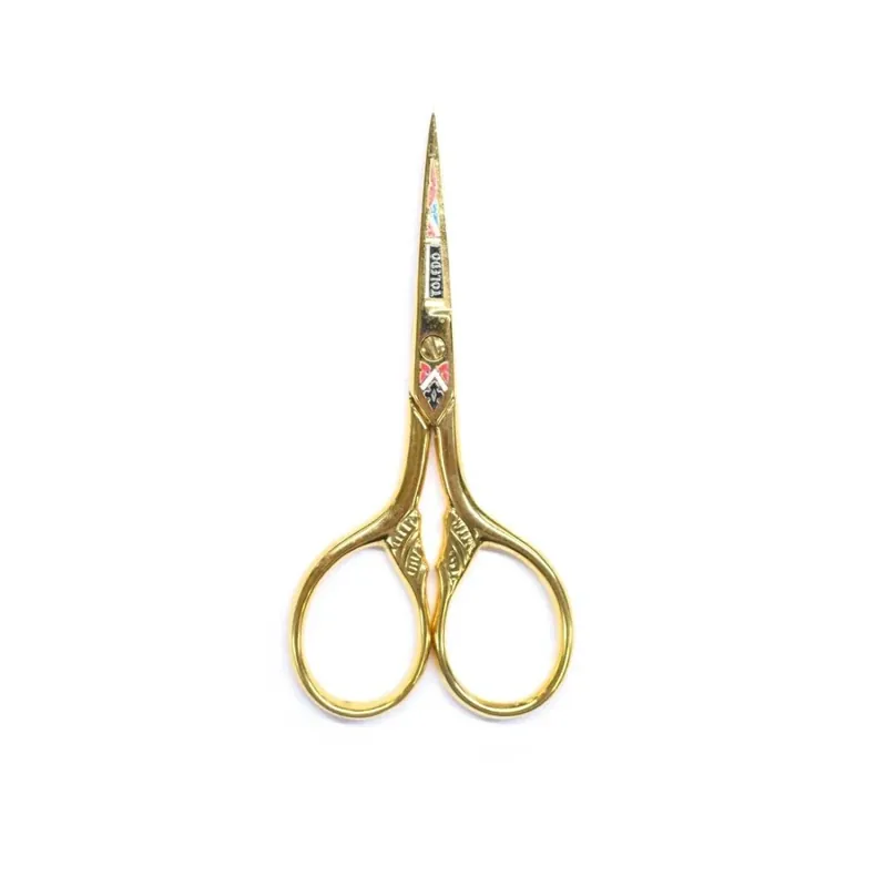 Tijera de bordar TOLEDO bañada en oro de 24K. Mide 3.5″ o 9cm de largo total. Tiene una hoja de 3cm. Tiene un grabado clásico con pequeños colores que hace que sea una tijera elegante y clásica. Es una tijera perfecta para todo tipo de labores y manualidades relacionadas con el bordado. Tiene un agarre fácil. Es una tijera con un acabado de gran calidad perfecta para regalar en una ocasión especial.