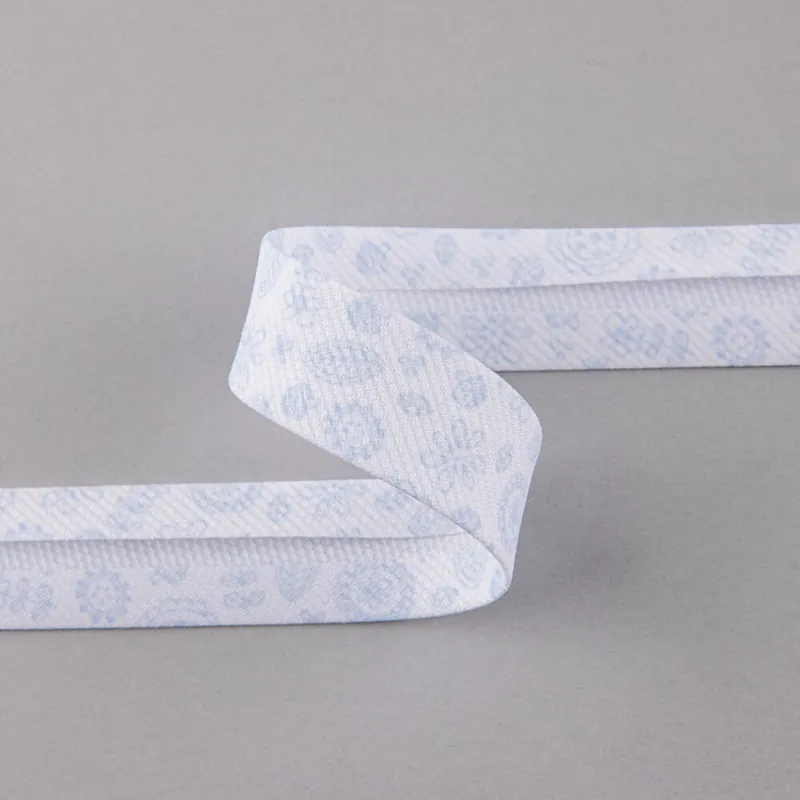 Cinta Bies perfilada estampada de hojas en tonos azules. Ancho de cinta de 18 milímetros. Combina con tus telas, precio por metro.