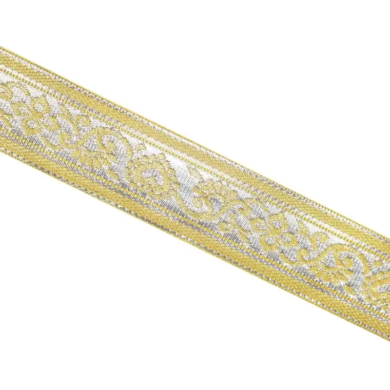 Galón metalizado de color dorado y plateado. Mide 40mm de ancho total. Con este galón podrás decorar todo tipo de prendas y accesorios dando un estilo más elegante y sofisticado. Tiene un diseño muy vistoso y llamativo. Se puede coser a todo tipo de sillones, colchas, sofás, cojines, vestidos… Es un galón muy utilizado en época de Semana Santa. Precio por metro.