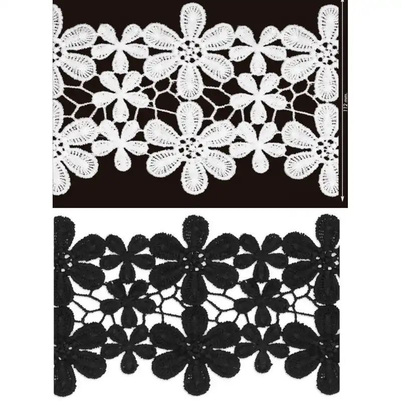 Este guipur de flores mate de 11,2cm de ancho es un encaje con motivos florales, disponible en blanco y negro. Perfecto para proyectos de costura y manualidades que requieren un toque elegante y delicado, con un acabado mate que le da un aspecto sofisticado. Se vende por metros, asegurando que obtengas la cantidad exacta que necesitas.