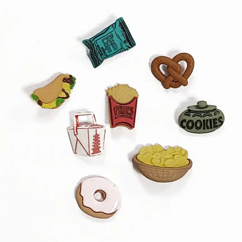 Este paquete de Botones con deliciosos aperitivos es el modelo Snacks y pertenece a la marca Dress It Up. Es una famosa compañía que se dedica a la fabricación de botones decorativos que cuentan con una gran calidad.