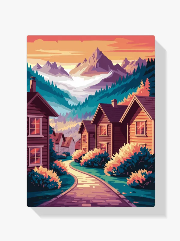 Entrega Rápida Pintar por Números – Pueblo de montaña al amanecer con picos neblinosos V1