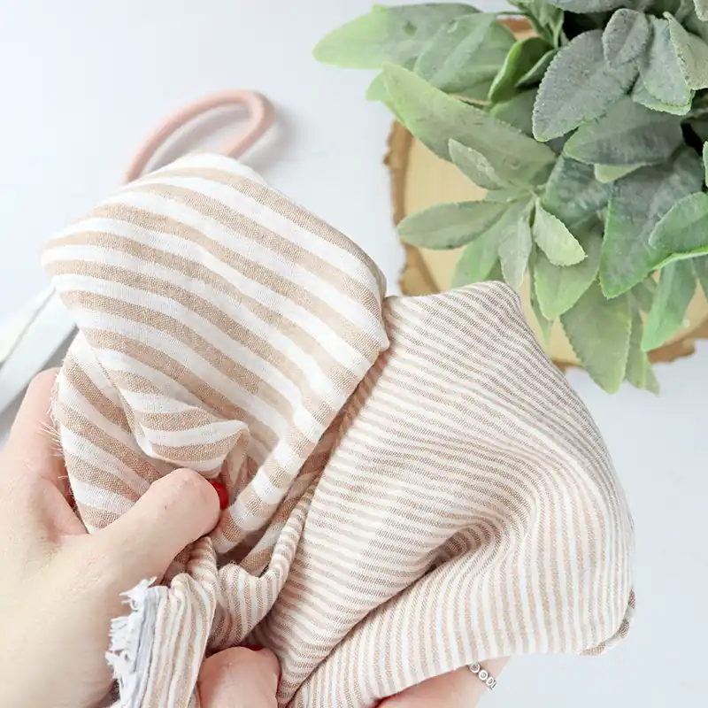 Muselina doble Listas Arena, realizada en algodón 100% para trabajos de costura y manualidades. La muselina en sí es una tela poco tupida, un poco transparente y a la vez sólida y resistente. Tiene un aspecto arrugado muy bonito, que aporta textura y a la vez ligereza.