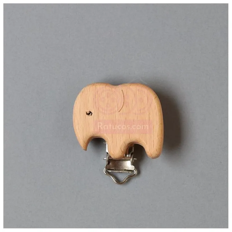 Pinza para chupetero en madera y con forma de elefante.