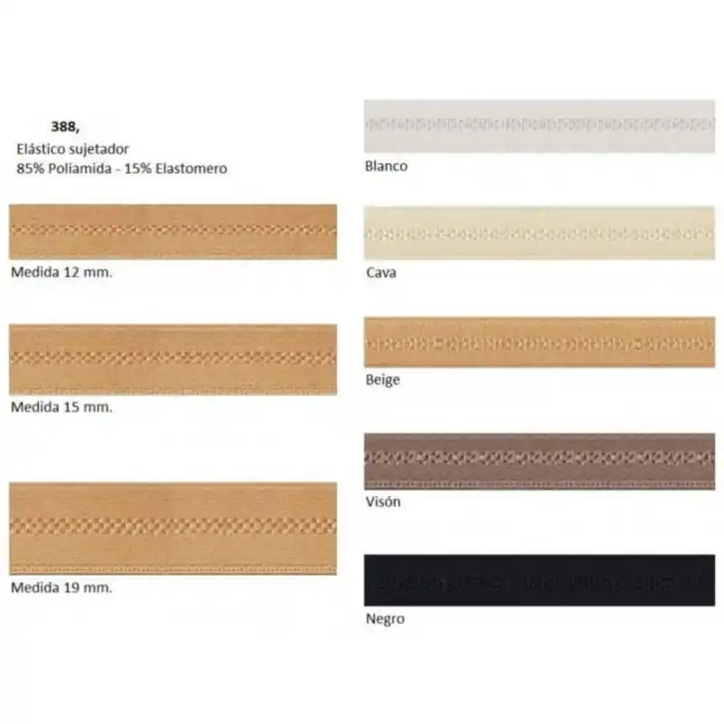 Cinta elástica de alta calidad, especialmente diseñada para la confección y reparación de tirantes de sujetador, corsetería y ropa interior. Fabricada con una composición de 85% Poliamida y 15% Elastómero, esta goma ofrece la combinación perfecta de suavidad, resistencia y elasticidad. Disponible en varios anchos (12 mm, 15 mm, 19 mm) y en colores básicos como Blanco, Negro, Beige, Cava y Visón. Se vende por metros, permitiendo adaptar la compra a las necesidades de cada proyecto de lencería o prendas deportivas ajustadas.