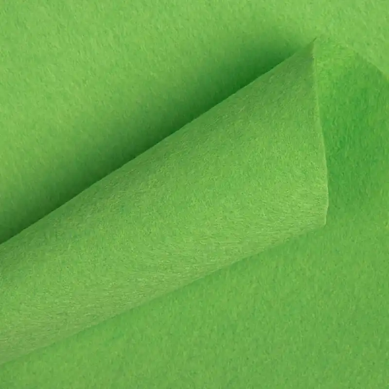 Tela de fieltro lisa de color verde. claro El fieltro es una tela de paño la cual su principal característica es que en su fabricación no se teje, lo cual facilita el trabajo ya que no se deshilacha. Es una tela muy usada en manualidades, ya que se puede recortar y pegar sin problemas. Tela ideal para la confección de disfraces para carnaval, para sombreros, tapetes de cartas y otras confecciones que requieran esta característica en particular.