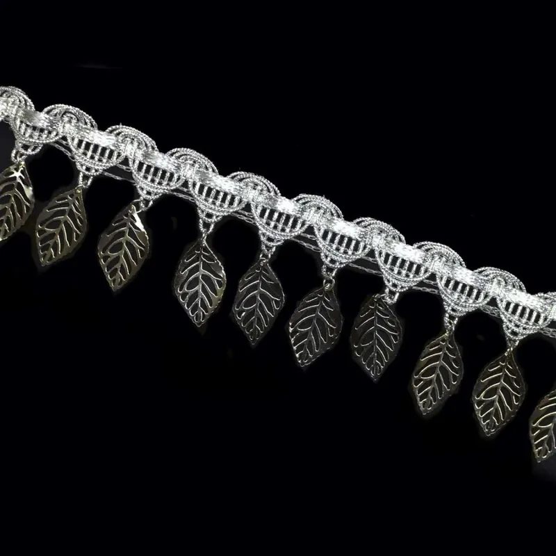 Fleco de hojas metálicas disponible en color dorado o color plateado. Este fleco, es perfecto para poder rematar tus prendas o accesorios. Podrás aportar gran movimiento a tu ropa, además de aportar luminosidad y brillo con sus colores metalizados. Podrás coserlo fácilmente en cualquier vestido, falda, bolsa, bolso… Muy utilizado también en disfraces. Sus hojas estarán en continuo movimiento, haciendo que el completento en el que lo pongas sea mucho más llamativo. Mide 45mm de ancho total. Precio por metro.