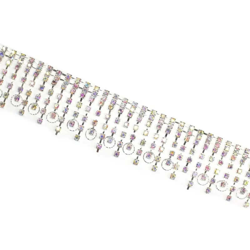 Fleco de pedrería multicolor. Con este fleco podrás customizar tus prendas dándole un estilo moderno y desenfadado. Sus pequeñas piedras aportarán mucho brillo y color a tu ropa. Puede coserse en vestidos, chaquetas, pantalones, faldas, chalecos… Mide 3cm de ancho total. Acabado de gran calidad. Precio por metro.