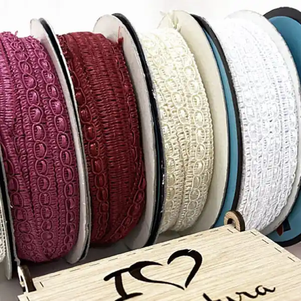 La cinta mide 10 mm de ancho aproximadamente y está fabricadas en poliester 100%.