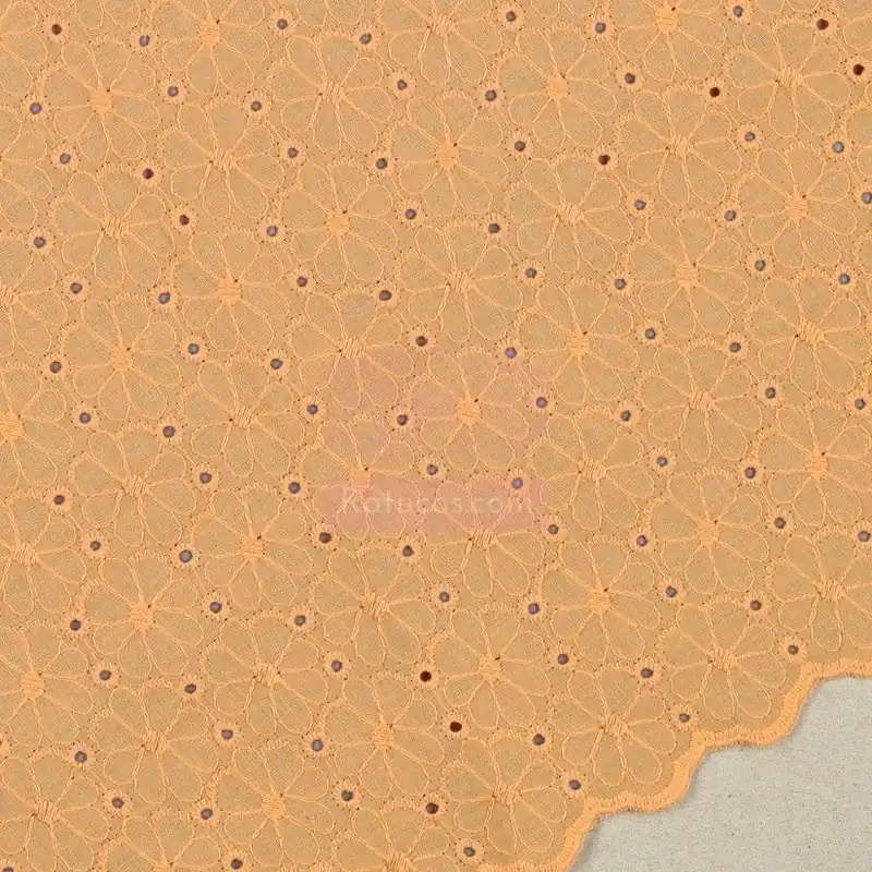 Tela de batista, en color mandarina, con bordado y calados y terminación bordada en uno de los orillos.