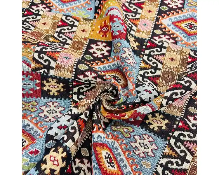 Apariencia: Suele tener un aspecto denso y pesado, con patrones complejos que pueden ser multicolores. Los diseños son típicamente jacquard, lo que significa que los hilos de diferentes colores se entrelazan para crear el patrón.