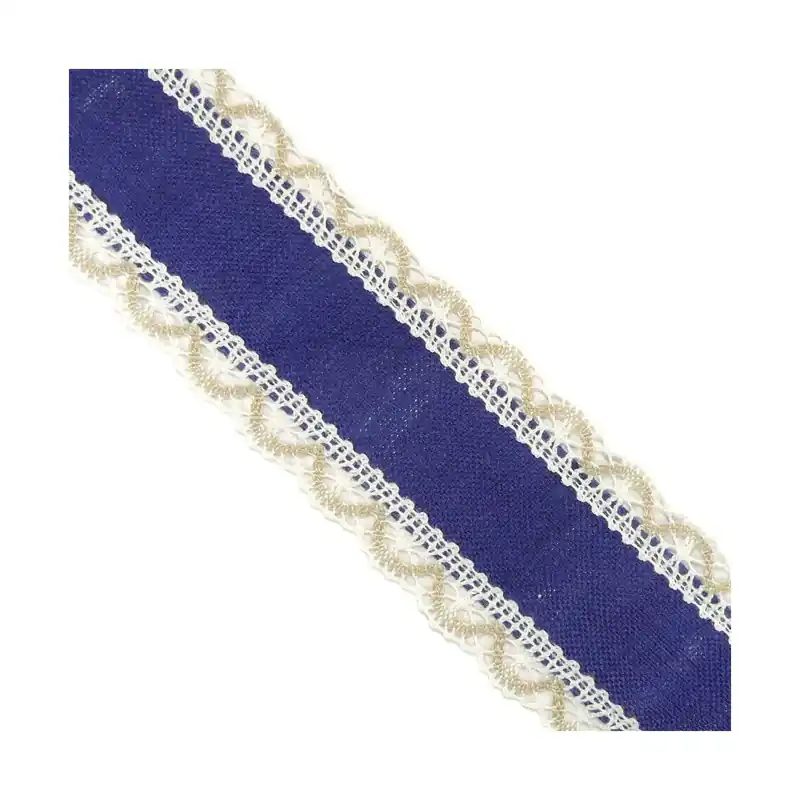 Con cinta mate de lino interior con puntillas de bolillos bicolor, realizada con 100% poliéster y 6cm de ancho.