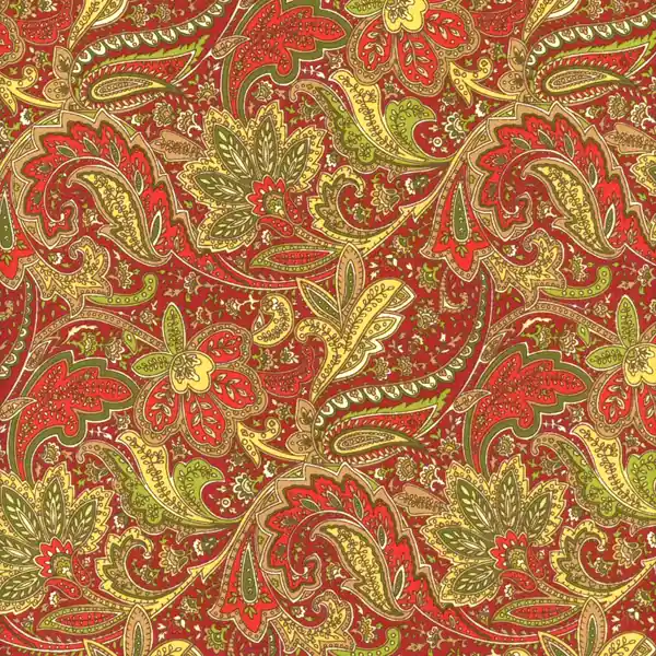 Tiene un fondo de color burdeos y su estampado de casimir y flores son en tonos amarillos y verdes.