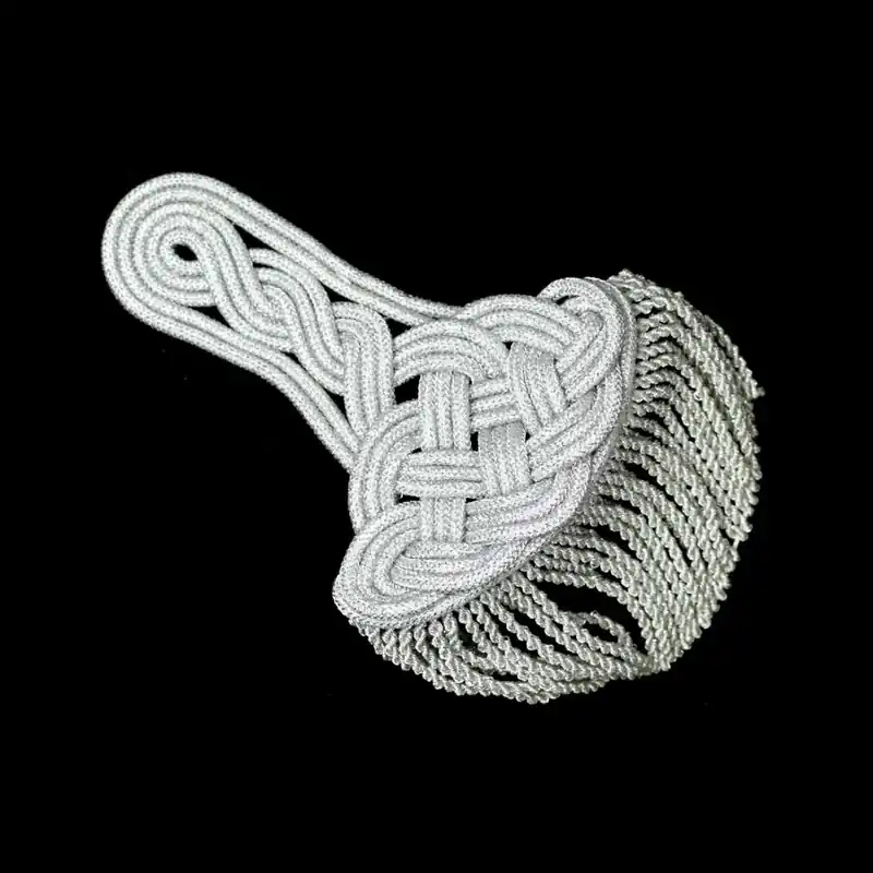 Par de hombreras para comunión disponibles en color dorado o plateado. Esta hombrera de pasamanería tiene un diseño con cordón trenzado y unos flecos de rapacejo metalizados. Cada hombrera mide 10cm de largo y 7.5cm de ancho sin flecos. Lo flecos miden 4cm de largo. Son hombreras perfectas para trajes de primera comunión, trajes de gala o uniformes.